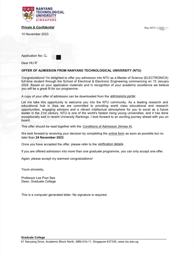 祝贺胡同学获得新加坡南洋理工计算机控制与自动化和电子学硕士两枚录取通知书!