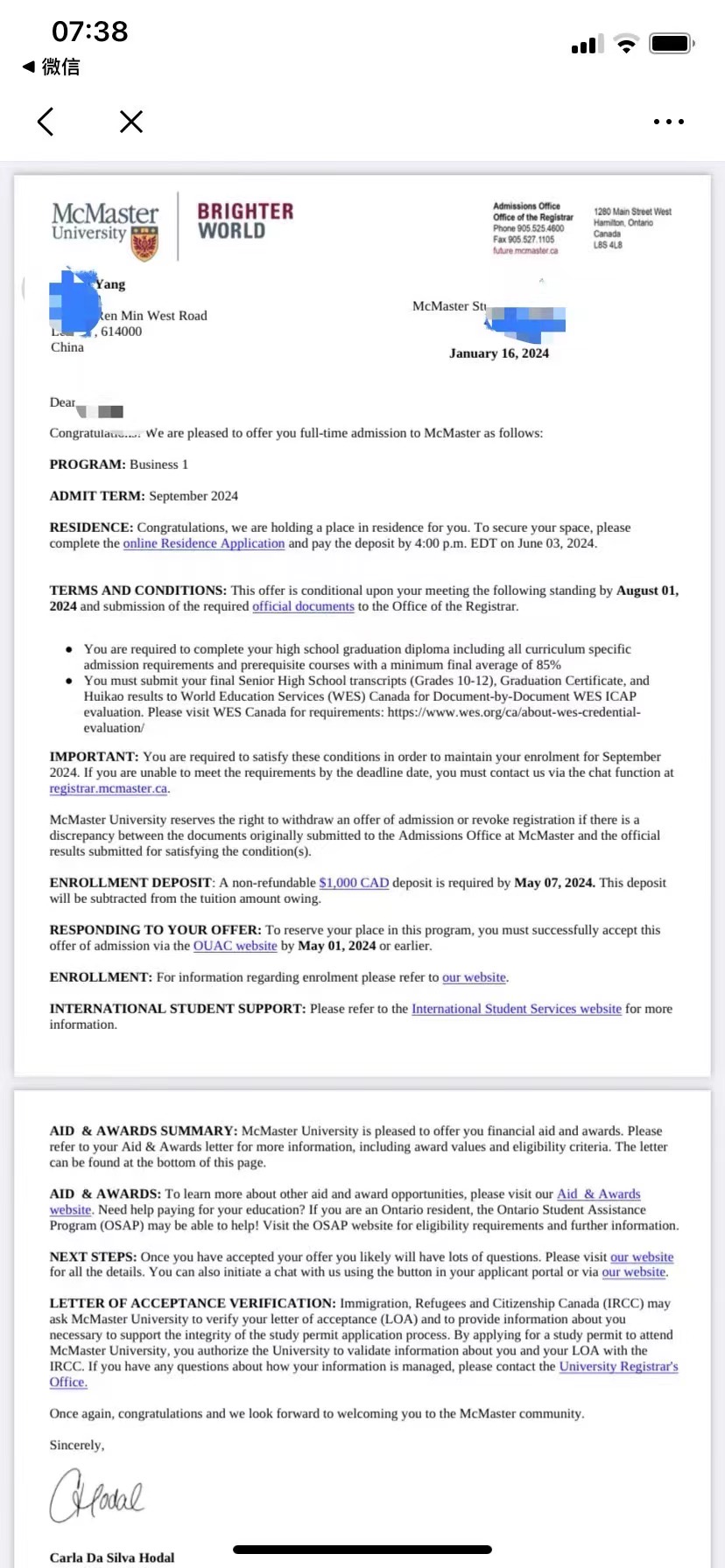 祝贺杨同学获得加拿大麦克马斯特大学商学本科录取通知书并获得26000加元奖学金!!!