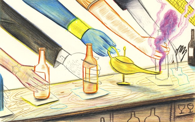 So the guy, who’s been watching all this, is surprised, because he didn’t know the bartender was gay. It doesn’t bother him; it just catches him off guard, you know? So he goes to the bathroom, to give them a little privacy. And there’s the genie.